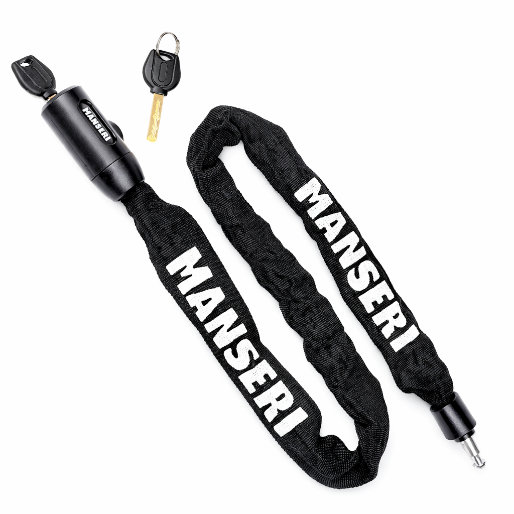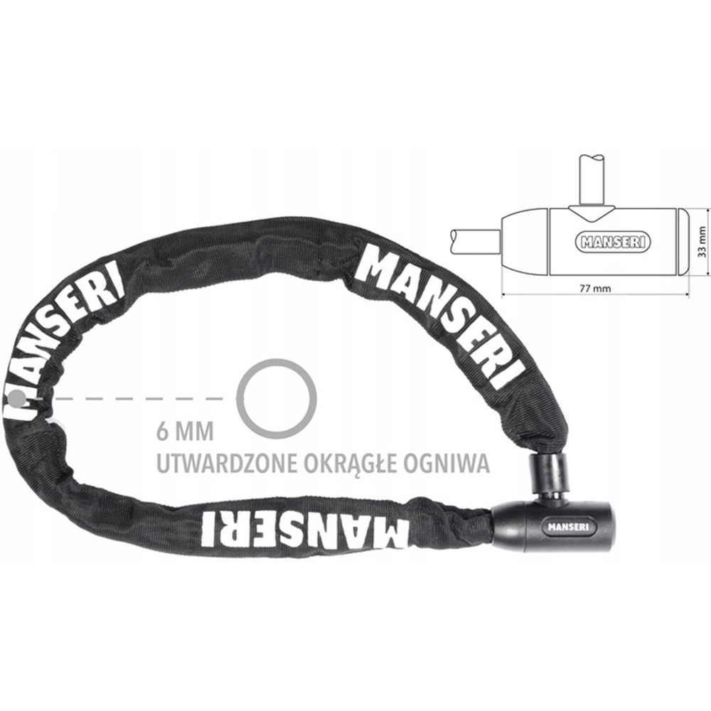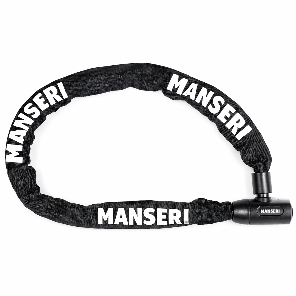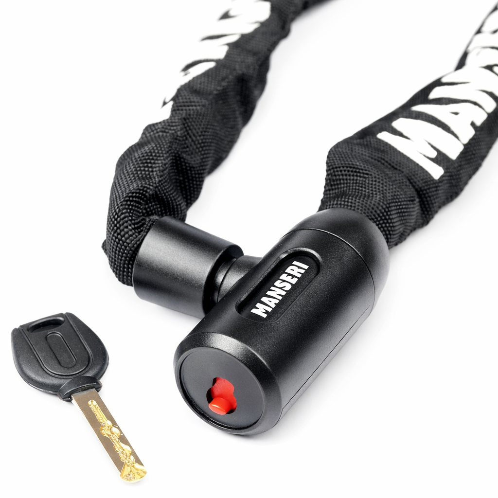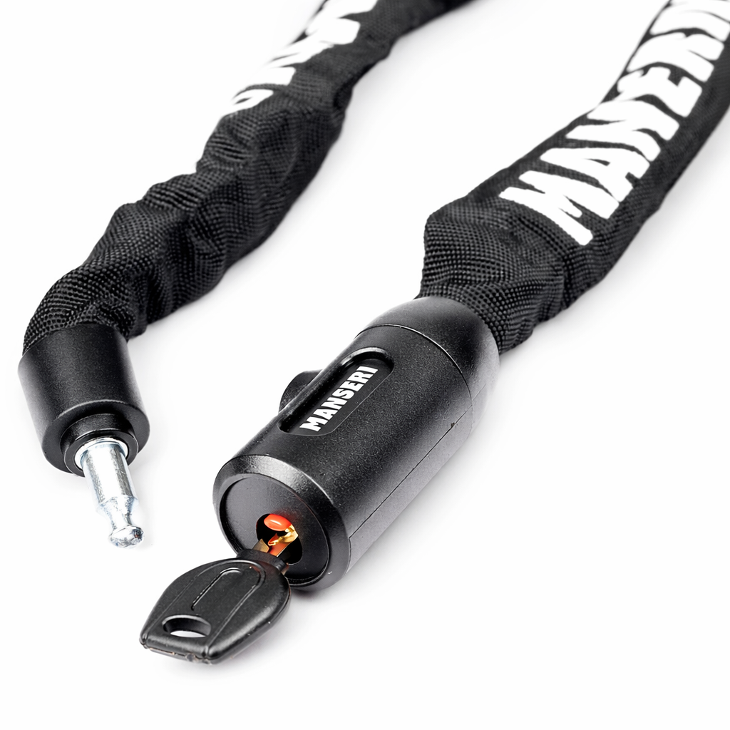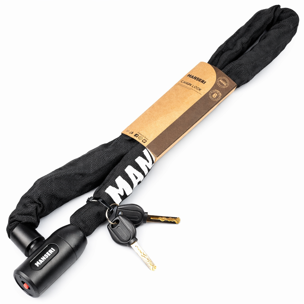 Hartowany łańcuch MANSERI o długości 90 cm umożliwia bezpieczne i uniwersalne zablokowanie roweru w praktycznie każdych warunkach.